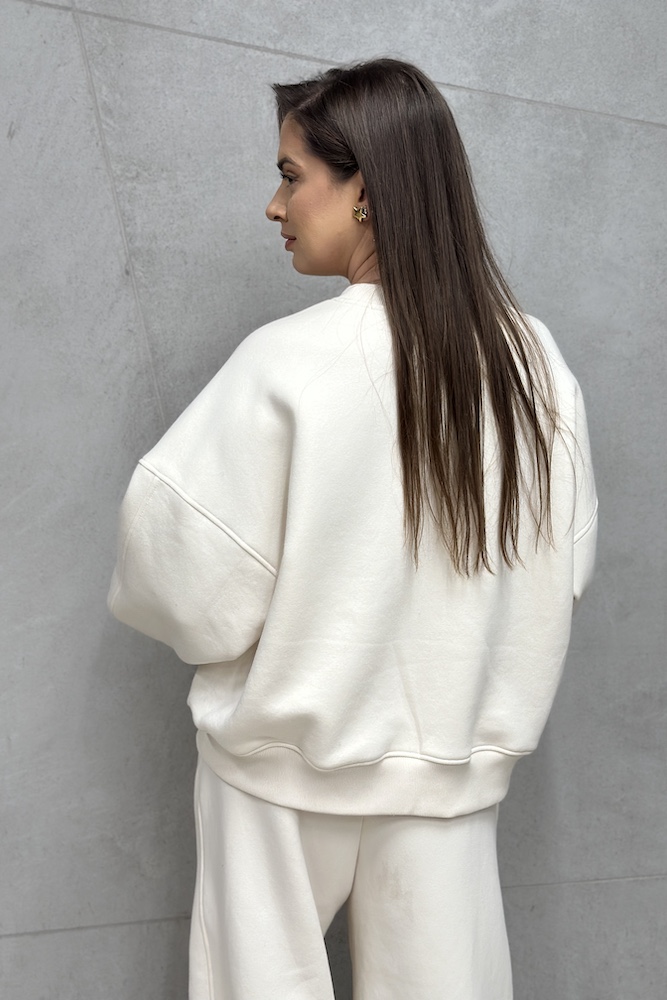 Komplet dresowy składający się z bluzy o swobodnym, lekko oversize'owym kroju z klasycznym, okrągłym dekoltem. Obniżona linia ramion oraz delikatnie zaznaczone cięcia konstrukcyjne nadają jej nowoczesny, minimalistyczny charakter. Dół bluzy oraz rękawy wykończone elastycznymi ściągaczami, które zapewniają wygodne dopasowanie i podkreślają staranne wykończenie. Jasny, kremowy odcień cozy pudding sprawia, że bluza doskonale wpisuje się w estetykę ponadczasowych basiców.